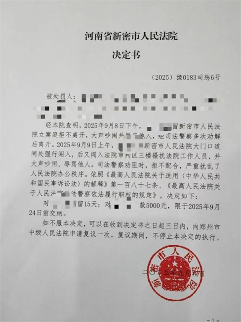 2025年9月9日,新密法院作出《司法惩戒决定书》,对阻碍执行公务的黄某某处以拘留15日,罚款50..