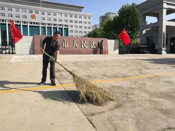 同时,在国庆节来临之际,为营造干净、欢乐、喜庆、祥和的节日气氛,弘扬和践行社会主义核心价值观,配合我市“双创”工作的顺利开展,全院干警分工明确,热情高涨,积极主动对新密法院内外的道路、绿化、果皮箱及卫生死角等进行了彻底的清洁打扫。