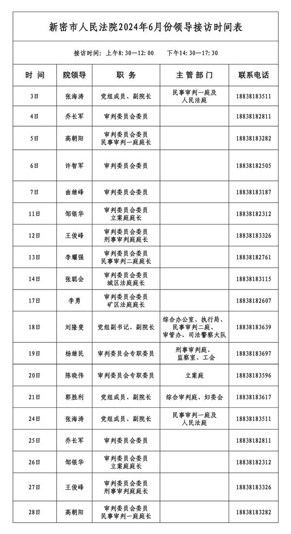 【公示】新密市人民法院2024年6月份领导接访时间表