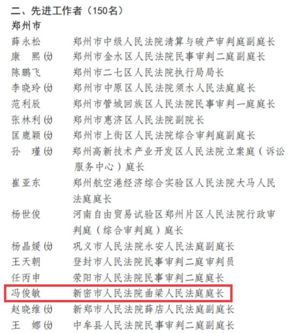 近日,河南省高级人民法院发布《河南省高级人民法院关于表彰河南省法院系统先进集体和先进工作者的决定》,授予新密市人民法院干警冯俊敏“河南省法院系统先进工作者”称号。