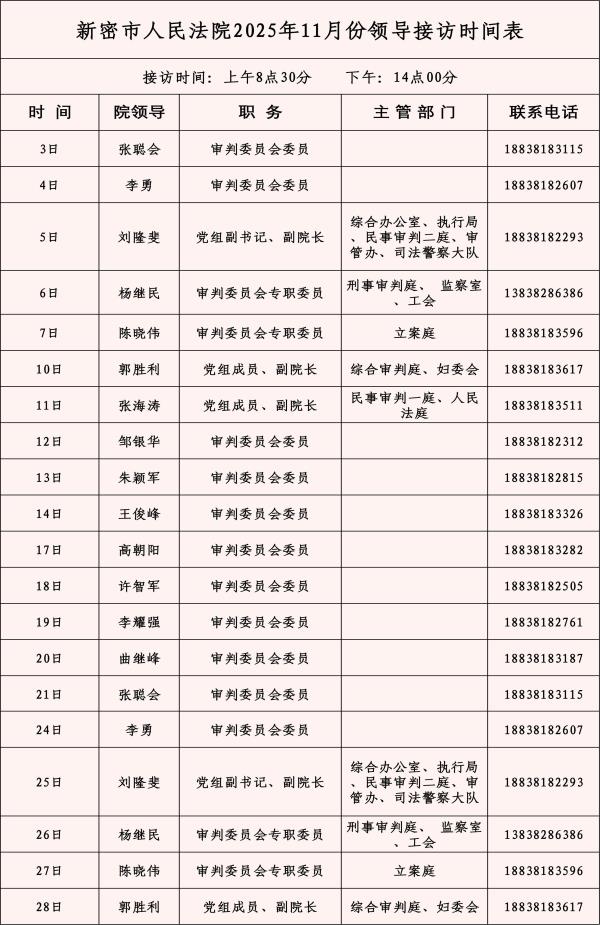 【公示】新密市人民法院2025年11月份领导接访时间表