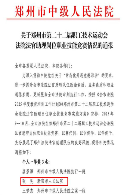 近日,郑州市第二十二届职工技术运动会法院法官助理岗位职业技能竞赛在郑州市中级人民法院举行。经过激烈角逐,新密法院刑事审判庭法官助理张昊荣获个人一等奖,展现了我院青年干警良好的精神风貌和过硬的业务实力。
