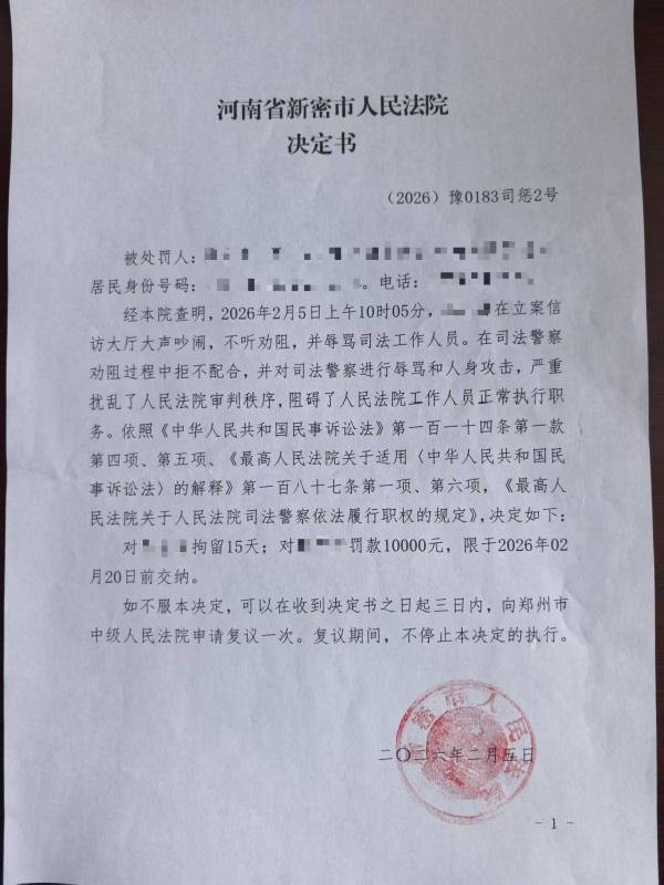 2026年2月5日,新密法院作出《司法惩戒决定书》,对不听劝阻,扰乱司法秩序的蔡某某处以拘留15日、罚款10000元的司法处罚措施。